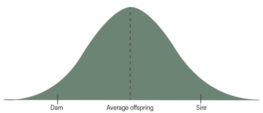 This kind of variation can be both helpful and frustrating. A mating that produces an outstanding calf one year might give a very average calf the next year. A mating that disappointed once might produce a great calf later on. Figure 2 shows how the EPDs of the calves spread out above and below the parents’ average due to Mendelian sampling. The randomness can surprise even the most experienced breeders; but without this natural variation, cattle would never improve over time.